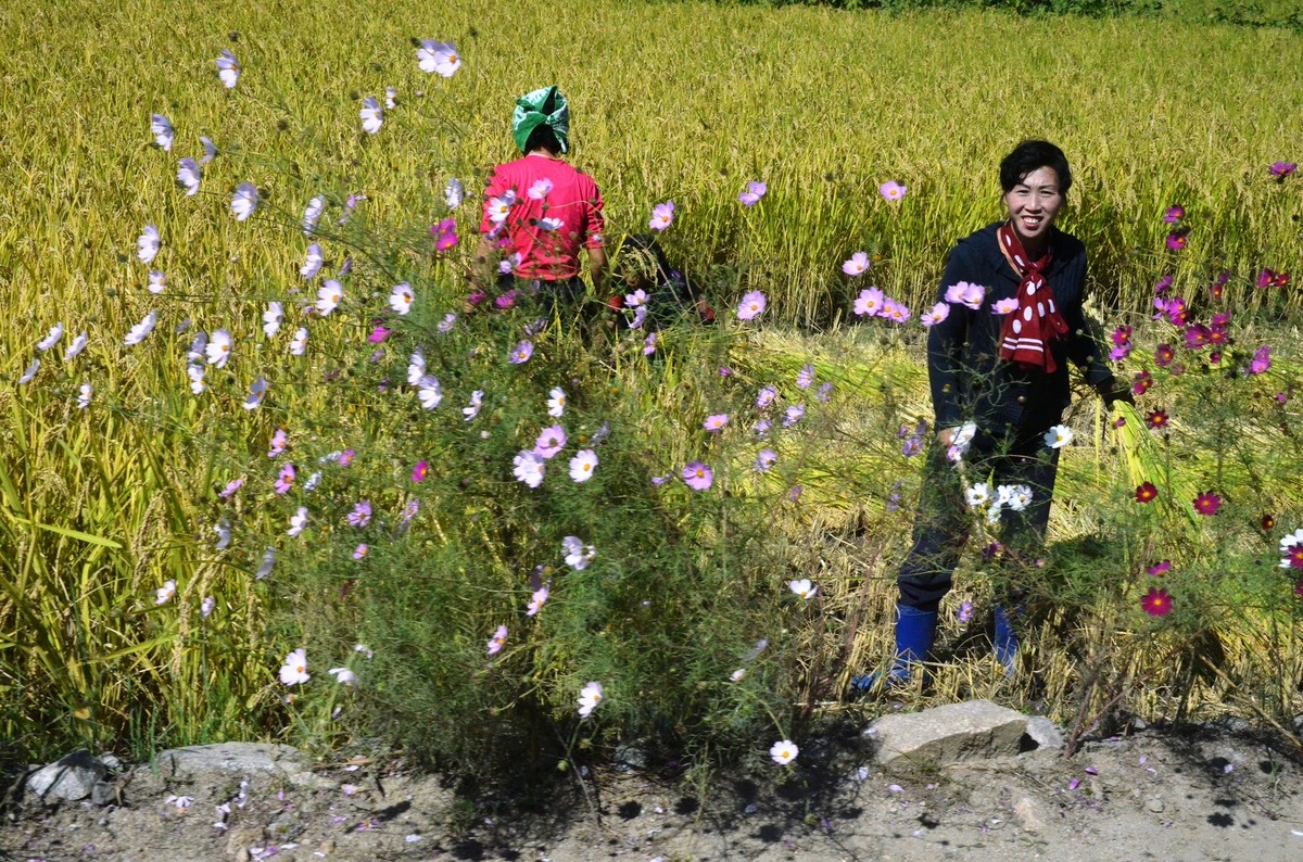 마침 수확기였다. 벼 이삭, 딱딱해 보이는 옥수수 알갱이가 촘촘히 익고 있었다. 지나는 사람들을 보아도 굶주리는 것으로 보기는 힘들다. "고난의 행군"으로 불리던 1990년대 후반에 비하면 식량 사정은 어느 정도 개선된 것 같다. 논가에는 자전거가 나란히 서 있었고, 많은 사람이 손으로 수확에 몰두하고 있었다.