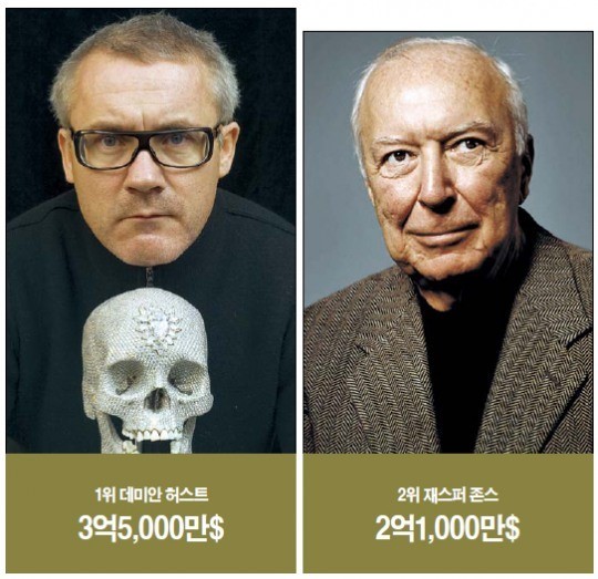 ▶생존작가 재산 톱(TOP)5는=지난해 싱가포르 자산정보업체 웰스엑스는 전세계에서 생존하는 화가 가운데 데미안 허스트가 가장 재산이 많다고 밝혔다. 그의 순자산은 3억5000만달러(약 3700억원)로 추산됐다. 이어 재스퍼 존스(2억1000만달러), 앤드류 비카리(2억1000만달러), 제프 쿤스(1억달러), 데이비드 최(1억달러)가 재산 순위 5위 안에 들었다.